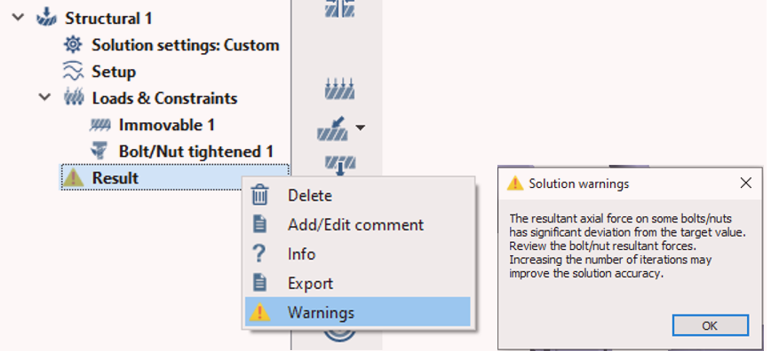 注: ナットの軸合力が10%以上逸れると、以下が発生します:- Projectツリーで、Resultsブランチの横に警告アイコンが表示されます。Resultsを右クリックし、Warningsを選択して表示します。