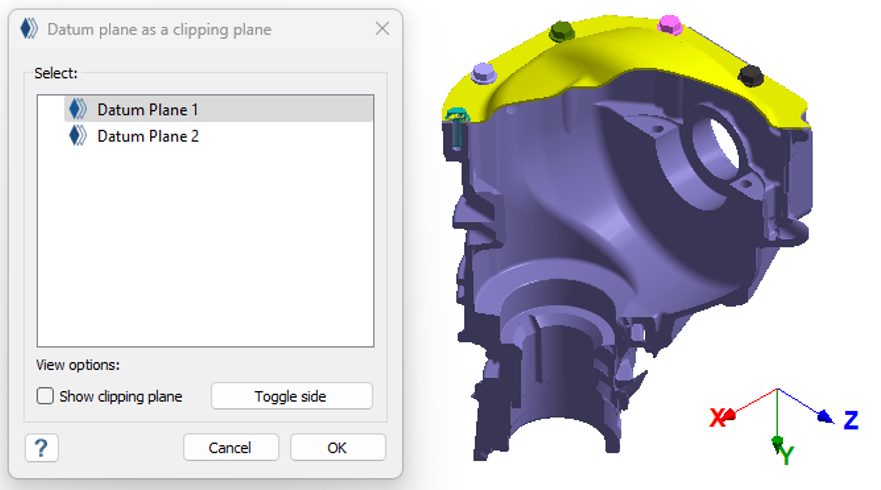 断面カットの結果を確認するために、パート/アセンブリのクリッピング平面として使用するデータム面を作成します。