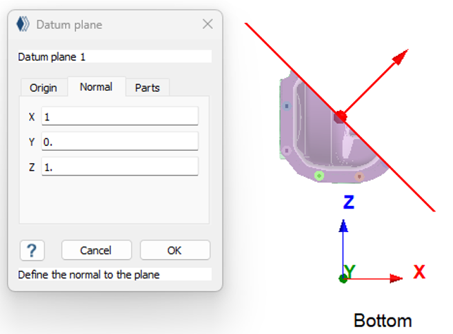 Tip: データム平面をXZ平面に沿って45度にするには、XとZに 1を入力します。