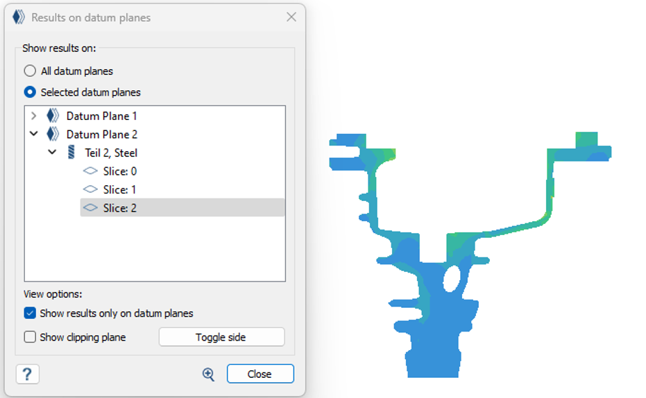 ダイアログで各データム面を展開し、関連するパートを確認します。さらに拡大すると、各パートのスライス数が表示されます。スライスを個別に選択すると、そのスライスのコンターを視覚化できます。