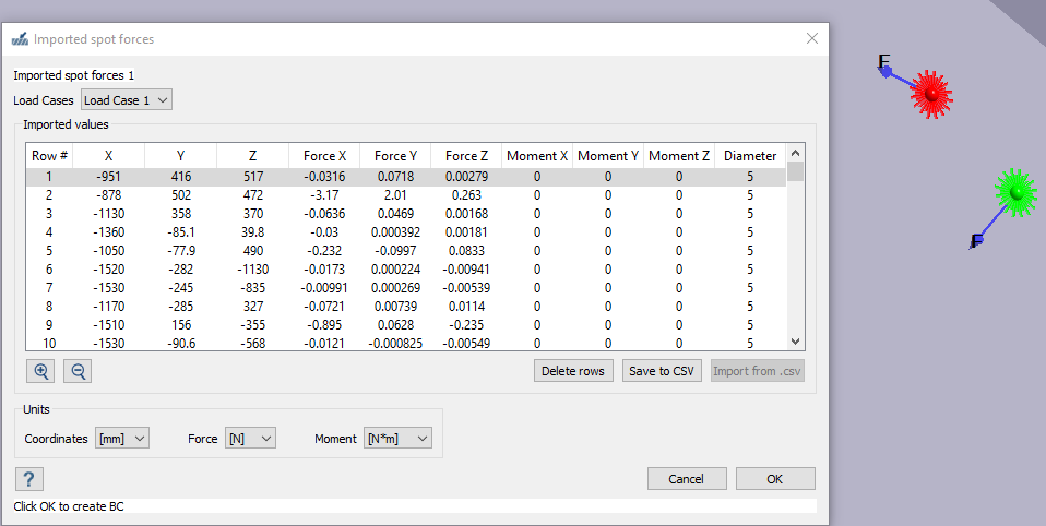 导入的力会显示在对话框中,并映射到模型视窗中创建的直径为 5 mm 的点上。您可以编辑对话框中的值以修改载荷位置、大小和载荷点直径。