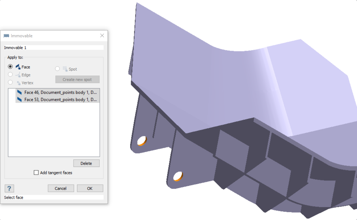 - 点击确定。新约束,固定 1 会出现在项目树中。约束的可视表示会显示在模型上。
