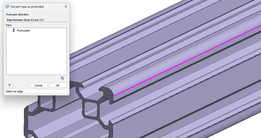 要定义突出方向,请沿零件长度选择任意边,如下图所示。