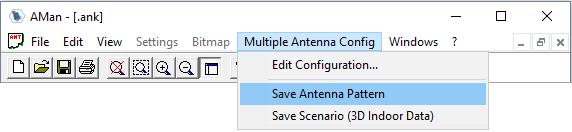 In the menu, Multiple Antenna Config the item Save Scenario (3D Indoor Data) is also available. With this item, the generated objects (masts, walls, arms, radomes) are exported in WallMan data format to be further processed and analyzed with WallMan.