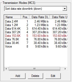 A list with all currently defined MCS can be found at Project > Edit Project Parameter and click the Air Interface tab. Further transmission modes can be defined, existing ones can be adapted during the planning process. The defined transmission modes can be sorted considering various criteria. The order of the MCS does not influence the simulations but the sequential arrangement in the Tree View and on the dialogs.
