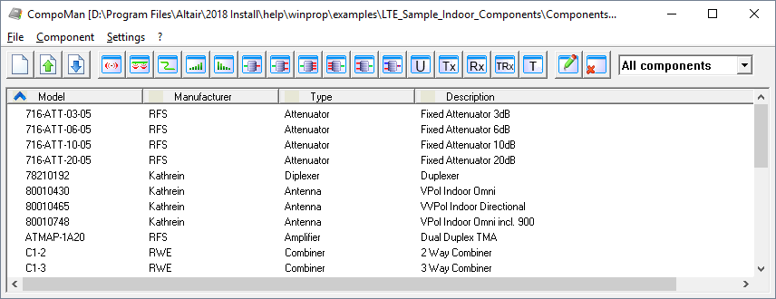 Model complex radio networks in indoor environments using predefined components from a component database.