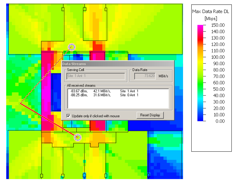 The above figure shows the active MIMO streams 1 and 2 contributing to the maximum data rate for a specific pixel (red shows the best received stream with the maximum data rate, in dark red color the other MIMO streams are given).