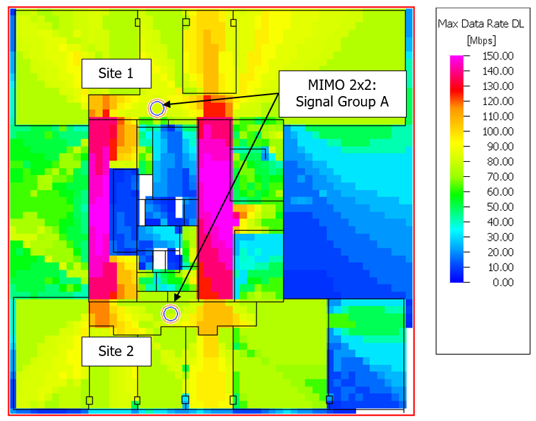 - Configuration 2: Both sites are MIMO antennas (Signal Group A) and transmit individual MIMO streams (site 1 MIMO stream 1 and site 2 MIMO stream 2).