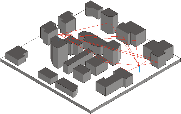 The second group of micro-cellular prediction models are deterministic and use ray-optical methods. They allow a site-specific, three-dimensional path loss and signal spread prediction including impulse response for base station heights below as well as above rooftop level. Hence, a three-dimensional description for the propagation environment including building shape and building heights has to be incorporated. Of course, due to the three-dimensional ray-optical methods, these models require a higher computation effort than the simplified approaches mentioned above. However, we developed a method to accelerate this ray-optical approach by an intelligent preprocessing of the building database which leads to computation times in the range of empirical models.