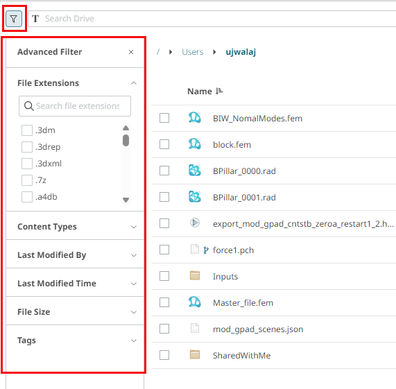 Using the Advanced Filter panel, you can filter files based on attributes such as file extension, content type, owner, modification time, file size, and tags.