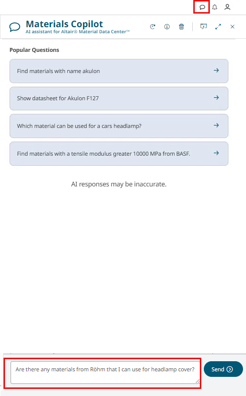 The Materials Copilot helps you quickly find material data, view datasheets, and apply filters using natural language questions. It suggests popular queries, interprets user input, and provides material lists with links to datasheets.