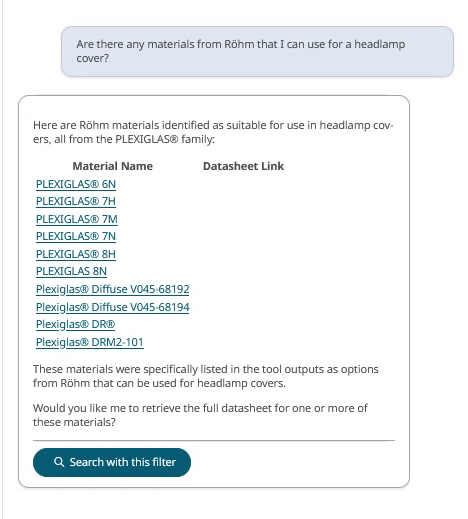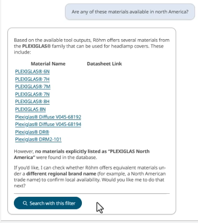 Yes, further options are provided.In this example, Materials Copilotsuggests Röhm Materials for Headlamp Covers available globally from PLEXIGLAS brand and in North America, Röhm Materials for Headlamp Covers under a different, ACRYLITE brand are displayed.Figure 4. Available Suggestions in Region