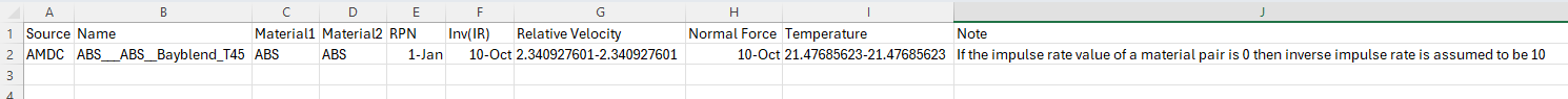 Table 1. Exported single material pair CSV file details Column Name Description Source Indicates the name from which the data is sourced. Name Displays names of a material pair. For example, ABS & ABS+PC, Bayblend T65. Material 1 Displays the first material name of the selected pair. Material 2 Displays the second material name of the selected pair. RPN Displays the RPN value. The same value is repeated after the hyphen for the material pair. Inv(IR) Displays the inverse impulse rate value. The same value is repeated after the hyphen for the material pair. Relative Velocity Displays the relative velocity value. The same value is repeated after the hyphen for the material pair. Normal Force Displays the normal force value. The same value is repeated after the hyphen for the material pair. Temperature Displays the temperature value. The same value is repeated after the hyphen for the material pair. Note Indicates the traceability (any changes made to the original dataset) of the data.