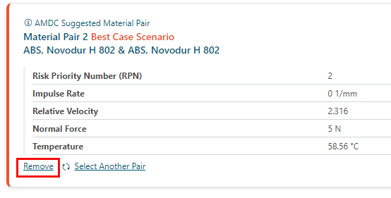 - Material Pair 2 Best Case Scenario: Based on your selection, AMDC suggests the opposite scenario. In the current example, AMDC suggests best-case scenario with lower impulse rate value and other material properties for the same selected material pair.